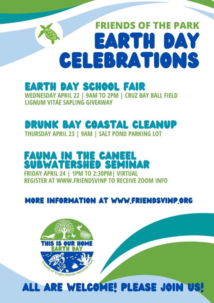 PRESS RELEASE – Friends of Virgin Islands National Park’s 17th annual Earth Day celebration includes the Earth Day Fair and Litter Stomp for school students, as well as a Drunk Bay coastal cleanup and a virtual seminar entitled Fauna of the Caneel Subwatershed.